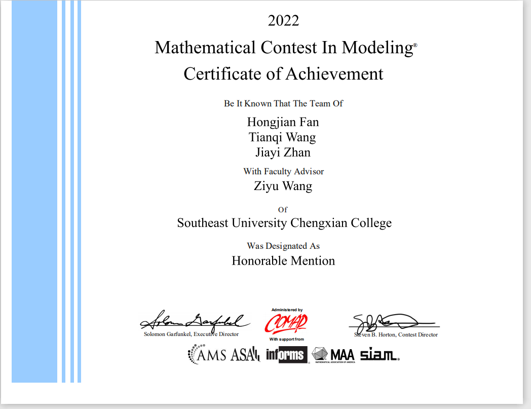20计算机科学与技术 范鸿渐 | 20计算机科学与技术 王天骐 | 20土木工程 展嘉怡 | Honorable Mention |