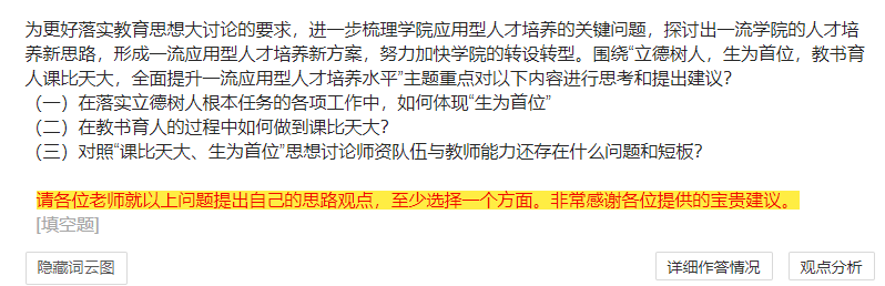 根据学院2022年第25号文件《关于开展“立德树人生为首位,教书育人课比天大,全面提升一流应用型人才培养水平”教育思想大讨论的通知》精神,基础部近期开展了教育思想大讨论的系列活动。为落实“生为首位,课比天大”的教育思想,基础部邀请全部基础课专兼职教师100多人参与教育教学研讨活动。此次系列活动有:向基础课教师(包括在我院任教的近100位兼职教师)发放调查问卷、组织部分教师进行专题研讨,并召开党支部书记和教研室主任会议,对反馈的意见进行认真分析和研判,提出解决方案和落实措施,确保我院基础课教学质量不断提高,为学院培养高质量人才打好基础。