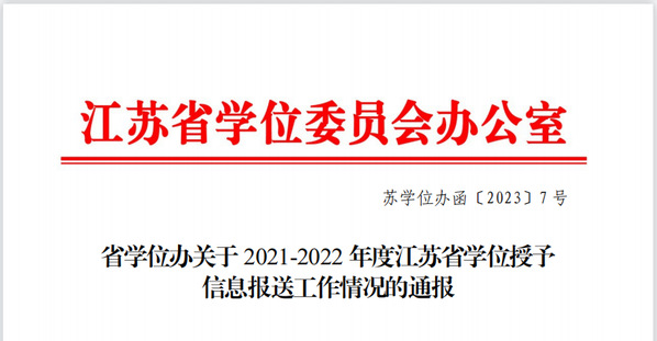 江苏省学位委员会办公室于近日发布了《省学位办关于2021-2022 年度江苏省学位授予信息报送工作情况的通报》(苏学位办函〔2023〕7号),国产视频 获评2021-2022年度江苏省学位授予信息报送工作通报表扬单位,教务处陈雪琼获评2021-2022年度江苏省学位授予信息报送工作通报表扬个人。