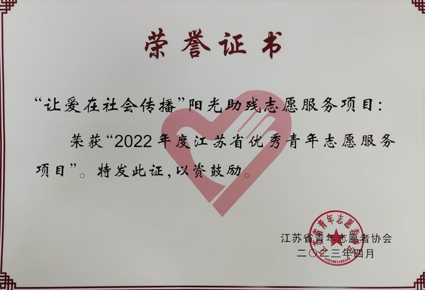 为推动全省青年志愿服务事业深入发展,总结经验、树立榜样、激励先进,引导广大青年积极参与志愿服务事业,展示新时代江苏青年志愿者的理想信念、责任担当,日前,江苏省青年志愿者协会开展了2022年全省青年志愿者行动先进典型评选表彰活动。国产视频 团委开展的“让爱在社会传播”阳光助残志愿服务项目获“2022年江苏省优秀青年志愿服务项目奖”,国产视频 团委冯杭州老师荣获“2022年度江苏省青年志愿服务事业贡献奖”,经济管理学院2020级市场营销专业傅子怡同学荣获“2022年度江苏省优秀青年志愿者”称号。