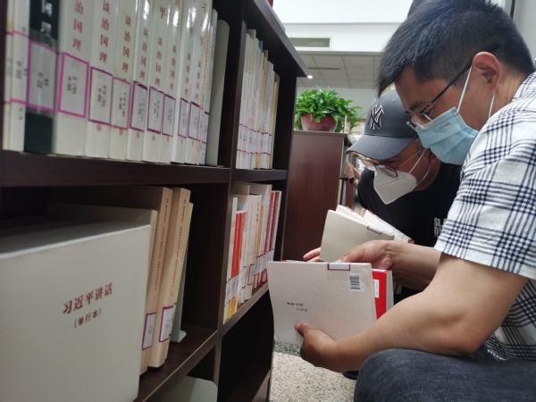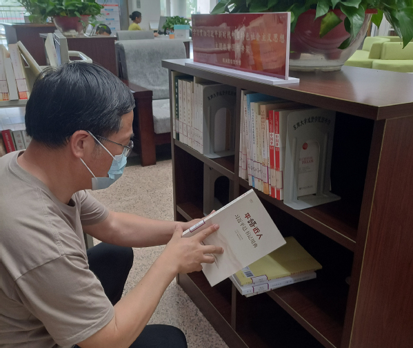 书架上摆放的《习近平谈治国理政》、《习近平新时代中国特色社会主义思想学习纲要》、《习近平讲话(单行本)》、《党的二十大报告辅导读本》等书籍,可供全校师生借阅。党员同志纷纷表示将不断深入学习习近平总书记的系列重要著作、经典论述和经典文章,希望相互推荐好书或分享阅读心得,从阅读中汲取知识,从阅读中领会中国共产党人的精神谱系,以实际行动践行共产党员的初心和使命。