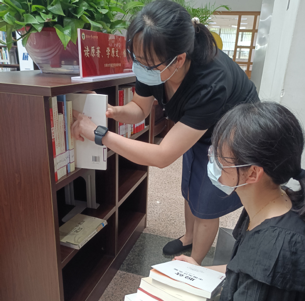 活动现场,图信党支部全体党员集中到图书馆一楼专题推荐书架区域,对红色书籍根据图书分类号进行整理、排序,再将图书逐一放置书架上,并保持整齐有序。