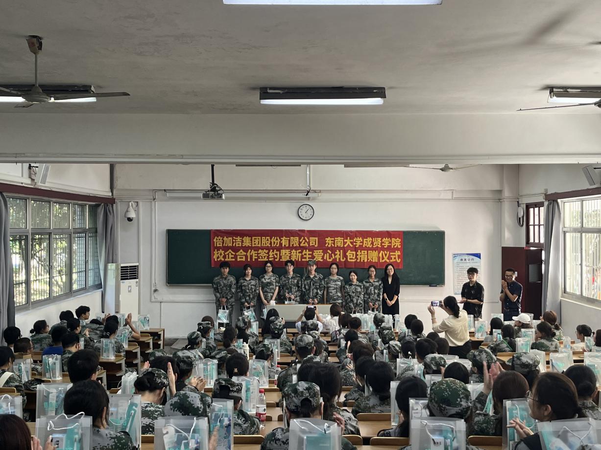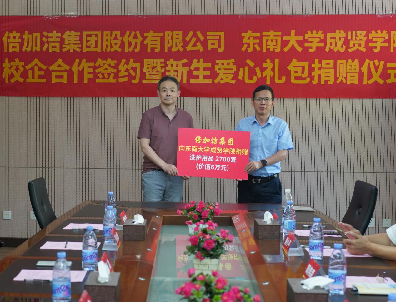 下午,唐凌总监代表集团为制药与化学工程学院新生代表发放了爱心礼包。此次倍加洁集团共向国产视频 2023级新生和教职工捐赠洗护用品2700套,总价值6万元。