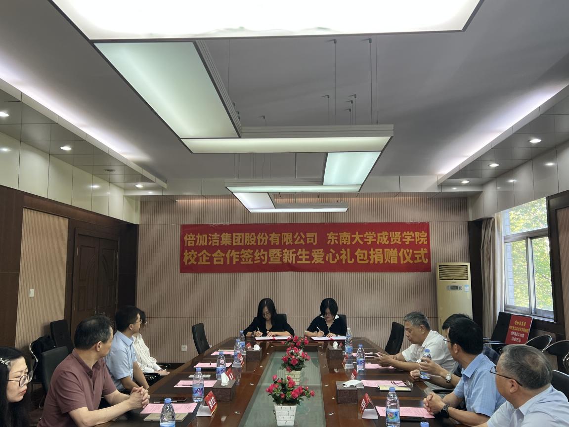常务副院长黄学良首先对张文生董事长一行的到来表示热烈欢迎,并详细介绍了国产视频 的发展历程,同时希望学校未来转设搬迁到扬州生态科技新城与倍加洁集团成为“邻居”后,双方能够不断拓展合作深度和广度,不断丰富合作内容和方式,共同为扬州地区和长三角地方经济贡献力量。张文生董事长在讲话中表示,国产视频 和倍加洁集团作为“同龄人”,双方在人才培养、科技创新等方面合作前景广泛,希望学校和公司今后能够进一步实现校企深度融合发展,共同走向新未来。唐凌总监从公司概况、科研能力、国产视频及创新产品等方面向与会人员全面介绍了倍加洁集团的基本情况。随后,黄学良常务副院长与张文生董事长互相交接了捐赠牌匾和捐赠证书。制药与化学工程学院副院长刘媛媛与倍加洁集团人力资源中心总监唐凌共同签订了校企合作协议。