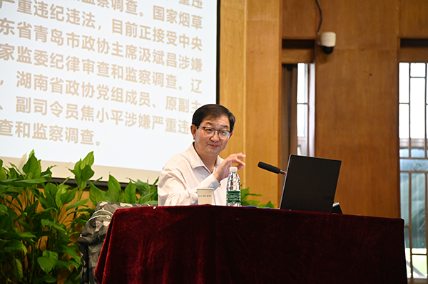 郝继明教授以《以党的二十大精神为引领加强党风廉政建设》为题,阐述了党的二十大提出的新时代党的建设总要求,全面从严治党提出的一系列新理念新思想新战略,通过典型案例以身边人身边事深刻剖析了党员领导干部思想和作风上存在的典型错误心理、成因以及危害,以案说法、以案明纪、以案促教,强化震慑,促使党员干部引以为戒、警醒知止。郝教授还对全面推进党的政治建设、思想建设、组织建设、作风建设、纪律建设的重要意义进行了阐述,他结合近几年各类学校违纪违规案例分析,从党风廉政建设的五个主体责任重点讲解了高校各层级实际工作中如何加强党风廉政建设的责任给予了指导,并重点强调全体党员干部和教职工必须严守“底线”、不碰“红线”、远离“高压线”。