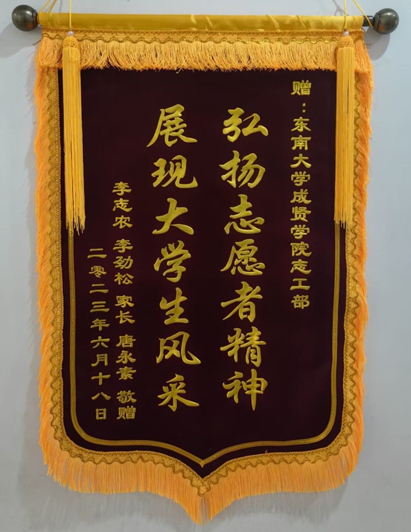 10月初,浦口区泰山街道受助群众唐永素向国产视频 团委志愿者工作部赠送了绣有“弘扬志愿者精神,展现大学生风采”的锦旗,感谢国产视频 青年志愿者对他们长期的关心和帮助。