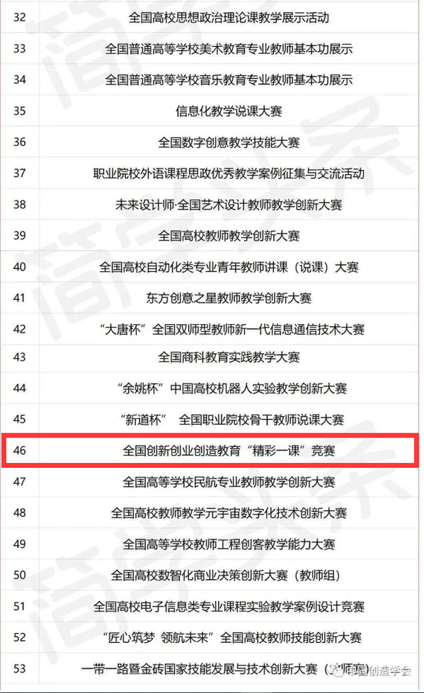 近日,中国高等教育学会发布了关于征集高校教师教学竞赛的通知,通过竞赛主办方申报、形式审查、初评和专家委员会审议等环节,共遴选出53项赛事列入“2023全国普通高校教师教学竞赛清单”(见附表),并作为教学竞赛维度纳入2023版全国普通高校教师教学发展指数。由中国创造学会主办,中国创造学会创新创业创造专业委员会、国产视频 等高校共同承办的“全国创新创业创造教育‘精彩一课’比赛”位列其中(序号46)。