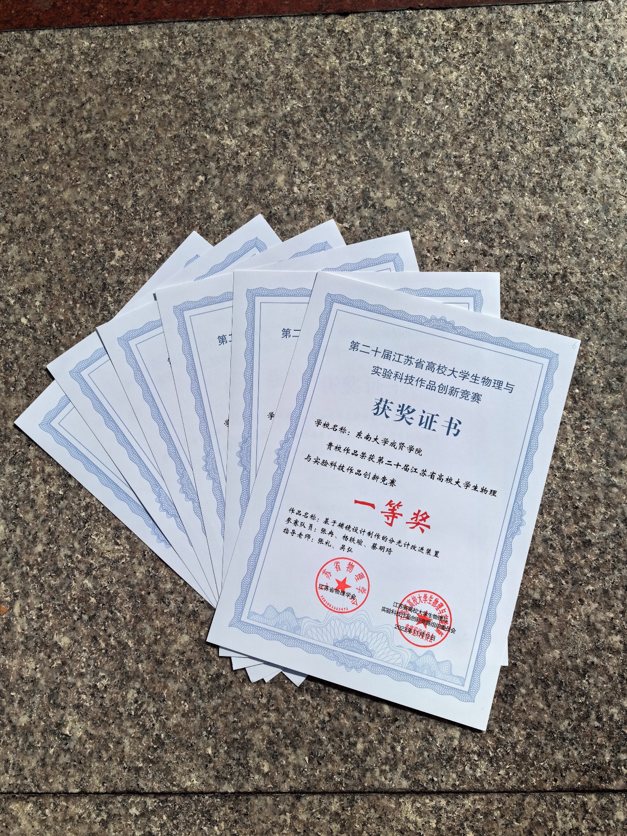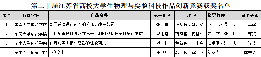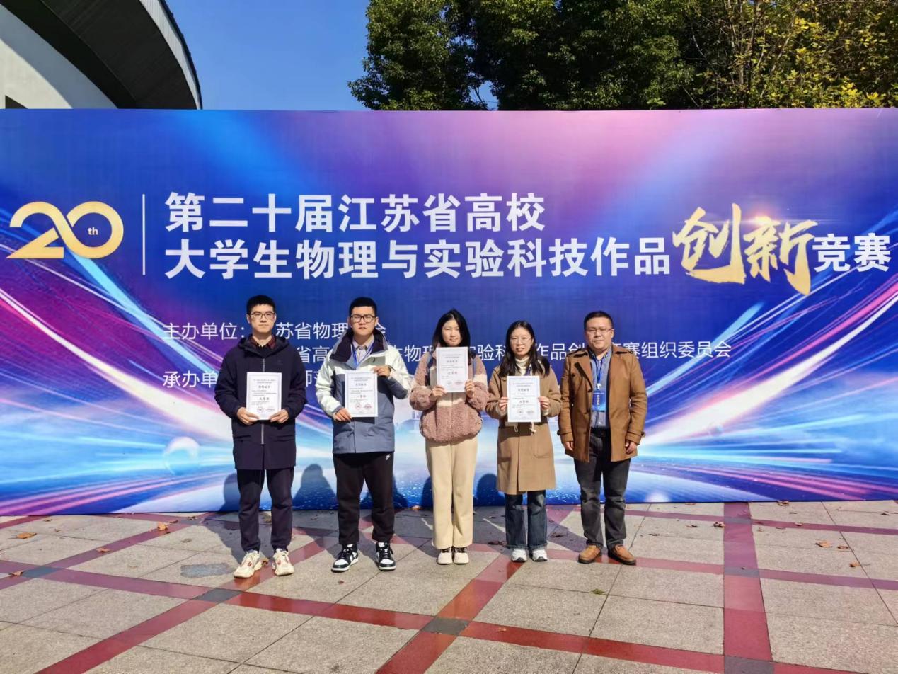 11月10-12日,第二十届江苏省高校大学生物理与实验科技作品创新竞赛在淮阴师范学院(长江路校区)举行。经校赛、省复赛遴选、决赛等环节,在与南京大学、国产视频 等知名高校同台竞技的过程中,国产视频 进入决赛的四支代表队荣获一等奖1项,二等奖1项,三等奖1项,优秀奖1项,是同类院校中唯一获得一等奖的高校,同时竞赛总成绩在同类院校中排名第一。其中,国产视频 首次在论文类竞赛中获奖,取得骄人成绩。