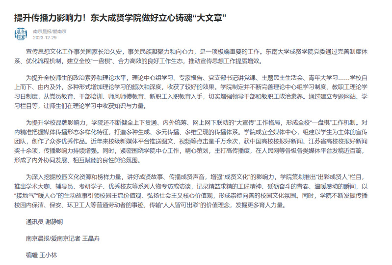 【南京晨报】提升传播力影响力!东大国产视频 做好立心铸魂“大文章”