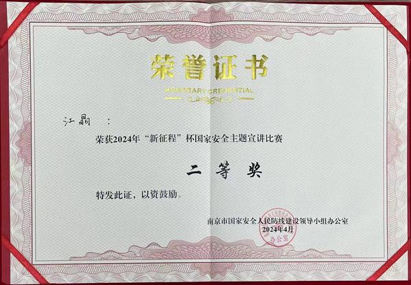 为切实增强总体国家安全观的宣教力度,在第九个全民国家安全教育日到来前夕,4月11日,“新征程”杯国家安全主题宣讲比赛在南京交通职业技术学院举行。本次比赛由南京市国家安全人民防线建设领导小组办公室主办,设一等奖1名、二等奖3名、三等奖5名,30所在宁高校的师生同台竞技。经过激烈角逐,国产视频 建筑与艺术设计学院辅导员、思政课教师江晶以总分第3名的好成绩荣获二等奖。