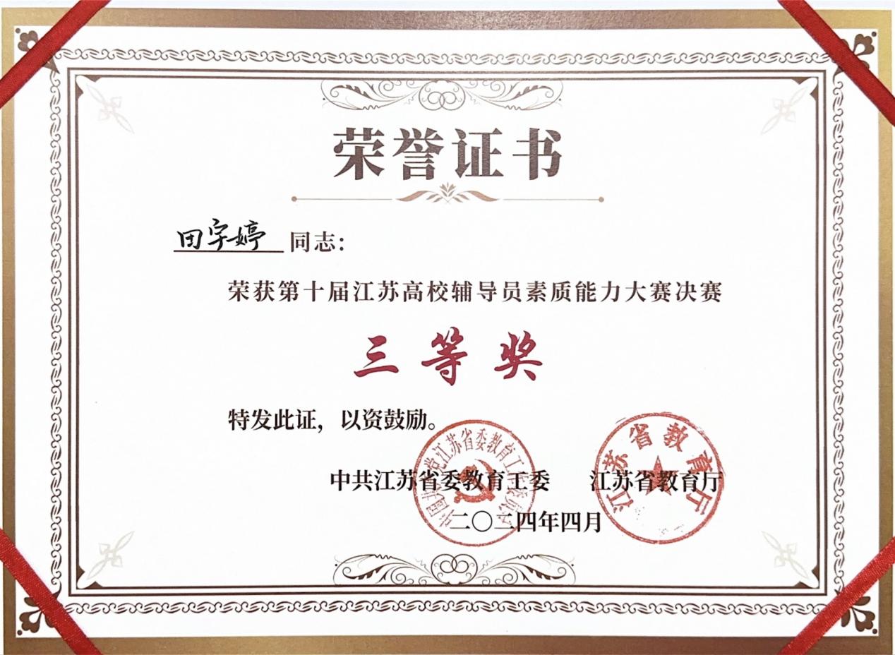 4月19日至20日,由江苏省委教育工委、江苏省教育厅主办的第十届江苏高校辅导员素质能力大赛决赛在南京医科大学举行,来自全省150所高校的150名辅导员经由7个研修基地复赛选拔,最终推选出40位辅导员同台竞技。国产视频 土木与交通工程学院辅导员田宇婷一路披荆斩棘,代表学校以基地复赛一等奖的优异成绩晋级决赛,并荣获决赛三等奖,这是国产视频 首次进入大赛决赛,实现了学校自参加此项赛事以来的历史性突破和最好成绩。