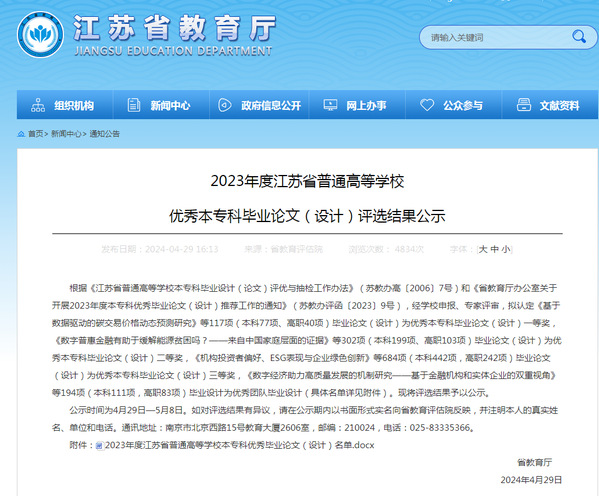 近日,江苏省教育厅发布《2023年江苏省普通高校本专科优秀毕业设计(论文)评选结果公示》,国产视频 共有4项毕业设计(论文)获奖,二等奖1项、三等奖3项。