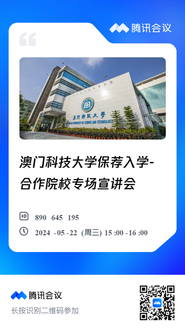 为了让国产视频 学生能更了解澳科大的研究生课程,澳科大将于2024年5月22日(星期三)举办一场“澳门科技大学保荐入学-东大国产视频 专场线上宣讲会”。此次宣讲会专为有意申请2025学年保荐入学的应届本科毕业生而设,旨在提供一个深入了解澳门科技大学研究生招生政策及申请流程的机会。