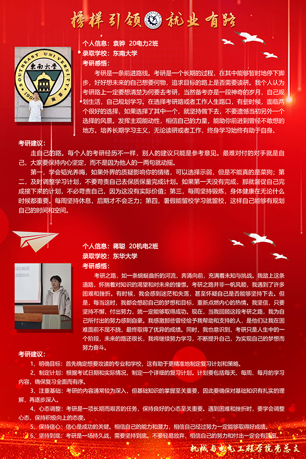 为了更全面展示机电学院2024届优秀毕业生代表的先进事迹和风采,机械与电气工程学院第二党支部举办线上线下相结合的毕业生就业典型人物事迹展,其中,线上主要通过学院网站、微信公众号、班级QQ群、微信群等不同形式向全院同学展示优秀毕业生的风采;线下主要通过制作宣传展板、光荣榜,召开主题班会和考研就业经验分享会等多种方式展示。10名成功考取硕士研究生的同学围绕学校及专业选择、备考规划、学习方法、心态调整等方面展开分享。他们从自身考研经历出发,讲述备考过程中面临的困难,分享亲身实践的成功做法,同时鼓励学弟学妹们要准确定位、持之以恒、相信自己。10名已签约单位的同学分别从职业规划、简历制作、面试技巧以及心理调适等方面展开分享。他们结合自身的求职历程,强调了扎实的专业基础、良好的心态、丰富的实践经历对于成功就业的重要作用。