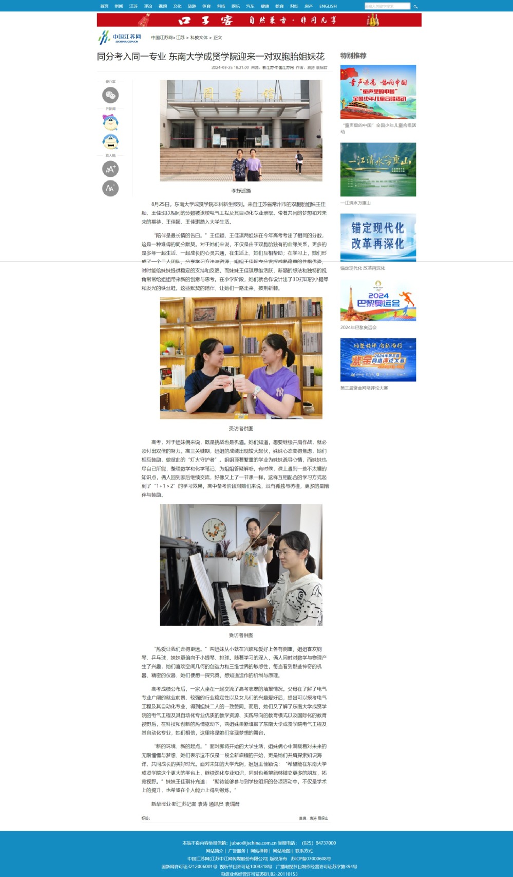 【中国江苏网】同分考入同一专业 国产视频 迎来一对双胞胎姐妹花