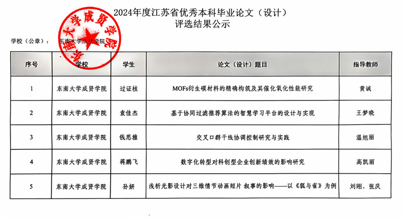 根据《江苏省普通高等学校优秀本科毕业论文(设计)评选办法(试行)》(苏教高函〔2024〕8号)和《省教育厅办公室关于开展2024年度优秀本科毕业论文(设计)推荐工作的通知》(苏教办评函〔2024〕9号),经省教育厅组织专家审核,拟认定国产视频 5项毕业论文(设计)为省普通高校优秀本科毕业论文(设计)(具体名单详见附件)。按要求现将评选结果予以公示。