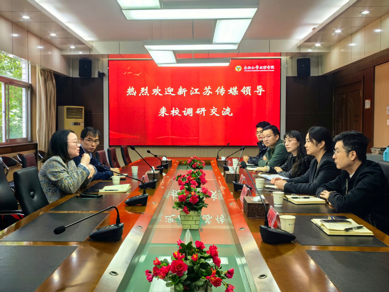 新江苏传媒对学院的热情接待表示感谢,并介绍了近期新江苏传媒面向社会和高校开展的重点活动。双方围绕主题党团活动开展、社会实践规划实施、AI与学科共建等方面进行了深入的探讨。