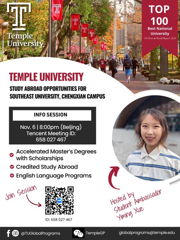美国天普大学是与国产视频 签署合作交流协议的大学之一。为了更全面了解该大学专业设置、项目优势、申请硕士条件及校园生活等内容,美国天普大学拟将为国产视频 学生举办“国产视频 线上宣讲会”,具体安排如下:
