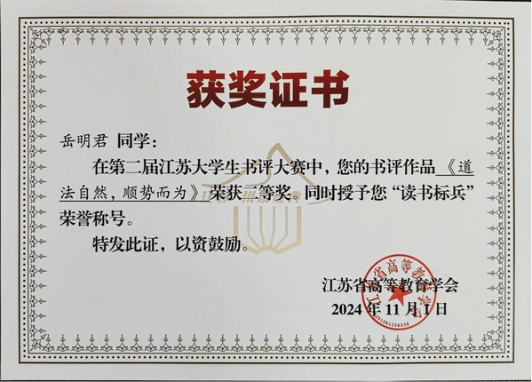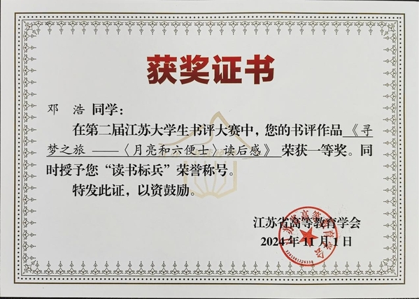 本次大赛书评内容涵盖文学经典、历史科学、哲学政治、人文艺术等大类。邓浩同学《寻梦之旅——月亮和六便士读后感》作品获得一等奖,岳明君同学《道法自然,顺势而为》作品获得二等奖,同时两位同学均获得“读书标兵”称号。