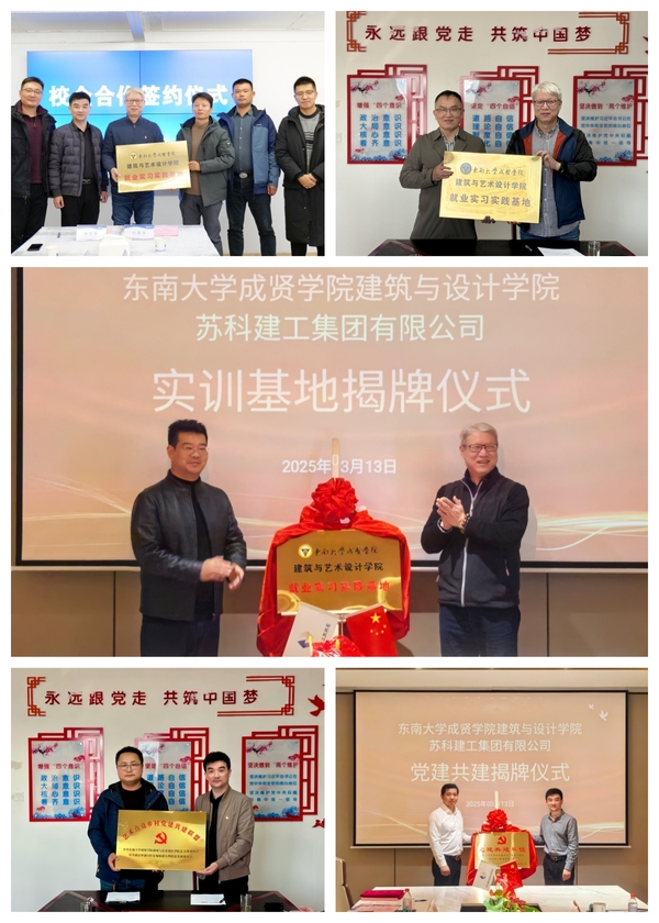 苏科建工集团有限公司是一家致力于房屋建筑、市政路桥、房地产开发销售、钢结构制造和物业管理的一体化公司。建艺院一行走访了苏科建工集团运管中心,并详细了解了集团的发展历程以及近年来集团党团工作取得的成果。校企双方针对人才培养、技术创新、资源优化等多个维度进行了深入的沟通与洽谈并达成了多项共识,同时签订了党建共建联盟协议书、挂牌“党建共建单位”,并签订了校企合作协议书、挂牌“国产视频 建筑与艺术设计学院就业实习实践基地”。未来,双方将通过共建学习基地、实践基地,在教学实践、就业探讨、服务社会等多方面建立长期、紧密的合作共建关系。