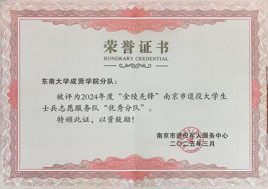 “金陵先锋”国产视频 国产视频 分队由南京市退役军人服务中心与国产视频 人武部联合组建,是一支以退役大学生士兵为主、辐射带动在校青年学子的特色志愿服务组织。近年来,团队始终秉承军人优良传统,在校内积极开展国防教育宣讲、红色文化传播、新生军训指导等特色工作,成为校园国防教育的重要力量。在校外服务方面,团队以高度的责任感和使命感投身社会公益事业。清明期间,团队受邀参与雨花台中学以史为镜,永志不忘主题教育活动,与1200名师生共同踏上9.8公里的徒步征程。志愿者们全程护航,确保队伍安全有序行进,经过3小时的精心组织,圆满完成了前往侵华日军南京大屠杀遇难同胞纪念馆的祭扫任务。此外,团队还积极参与南京市退役军人事务系统铸魂·清明祭英烈活动,在六合区桂子山烈士陵园协助维持现场秩序,以庄重的仪式表达对革命先烈的深切缅怀和崇高敬意。分队以专业素养和严谨作风赢得各方赞誉,成为展现成贤学子精神风貌的“迷彩名片”。