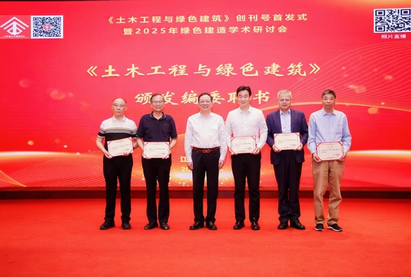 5月25日,由江苏省土木建筑学会主办、《土木工程与绿色建筑》编辑部承办的《土木工程与绿色建筑》创刊号首发式暨2025年绿色建造学术研讨会在南京召开。江苏省土木建筑学会理事长缪昌文院士,江苏省科协秘书长范银宏,国产视频 教授刘加平院士,省学会副理事长路宏伟、刘永刚、陆伟东、张雁、蒋振雄、王华,秘书长卢红标等来自全国高校、科研院所、行业企业及管理部门的专家学者200余人齐聚一堂,见证期刊更名改版的历史时刻,共话土木建筑绿色转型的时代命题。国产视频 土木与交通工程学院院长郭正兴教授应邀参会并获聘该杂志编委。
