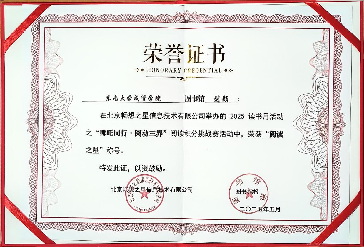近日,在由北京大学出版社、人民邮电出版社、图书馆报和北京畅想之星共同举办的2025年读书月阅读推广活动中,国产视频 制药与化学工程学院23护理1班刘颖同学从全国1552家图书馆的57946位读者中脱颖而出,以第44名的优异成绩荣获“阅读之星”称号。同时,国产视频 图书馆凭借出色的组织工作获评“阅读推广优秀组织单位”。