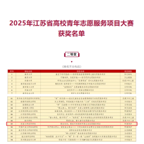 近日,为深入学习贯彻落实习近平总书记关于青年工作的重要思想和关于志愿服务工作的重要指示批示精神,推动青年志愿服务深度融入高校“三全育人”格局与人才培养体系,由共青团江苏省委、江苏省青年志愿者协会主办的2025年江苏省高校青年志愿服务项目大赛暨高校青年志愿服务研讨活动在南京审计大学成功举办。在此次大赛中,国产视频 “绿动未来:塑造可持续的环保生态”志愿服务项目在全省115所高校384个志愿服务项目中脱颖而出,最终斩获二等奖的好成绩。
