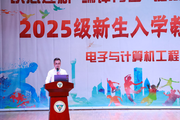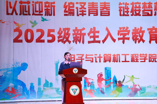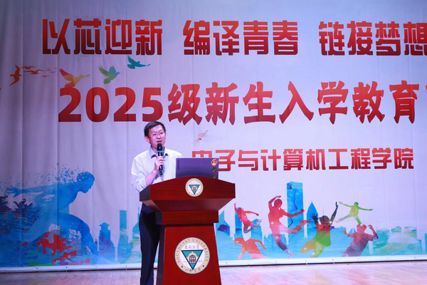 为帮助新生适应环境、做好学业规划,10月10日下午,电子与计算机工程学院在综合楼报告厅开展“以芯迎新,编译青春,链接梦想,e启未来”2025级新生入学教育系列活动。学院执行院长王晓蔚、党总支副书记苏力、副院长朱林,综合办主任、分团委书记、新生辅导员,及全体新生共400多人参加了活动。